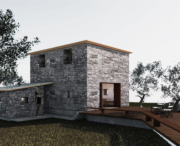Η λύση που προτείνεται για την νέα χρήση (εξοχική κατοικία) βασίζεται στην υπάρχουσα λογική των δυο ορόφων, δηλ την ανά-δημιουργία του ξύλινου παταριού. Στο ισόγειο βρίσκονται οι χώροι διημέρευσης και στον 1ο όροφο, 2 υπνοδωμάτια. Η εσωτερική σκάλα στο κέντρο του σπιτιού που λειτουργεί ως διαχωριστικό, θεματίζεται στην λύση, μιας και τυπολογικά είναι μια αντίθεση. Το μπάνιο βρίσκεται εκτός του υπάρχοντος περιγράμματος, ως νέα όμορη κατασκευή, προκειμένου να μην αλλοιωθεί η υπάρχουσα δομή, αλλά και για να υπάρξει άμεση σύνδεση με το χώρο του τζακιού που ζεσταίνει και το νερό.