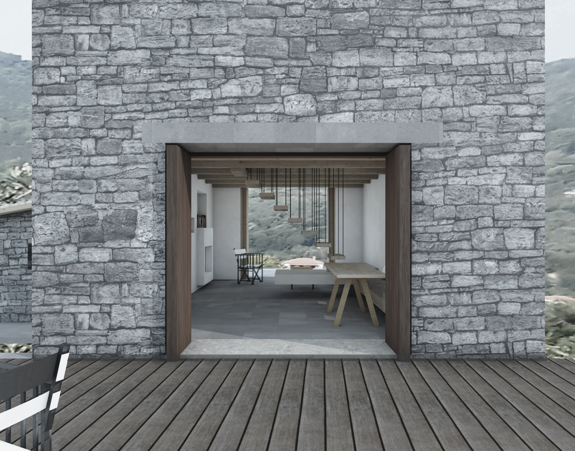 Τα 2 νέα ανοίγματα στο ισόγειο δημιουργούν έναν διαμπερή χώρο που συνδέει τους 2 βασικούς εξωτερικούς χώρους διημέρευσης. Αυτά κατασκευάζονται από οπλισμένο σκυρόδεμα στην λογική όμως των παλιών ξύλινων υπέρθυρων. Εξωτερικά η λύση προτείνει την υπάρχουσα εμφανή πέτρα, ενώ στα σημεία που έχει τοποθετηθεί κονίαμα, αυτό αποκαθίσταται. Έτσι η κατοικία εξακολουθεί να αποτυπώνει στο κέλυφος την ιστορία της, ενώ εσωτερικά μένει αναλλοίωτη αίσθηση του τύπου της μονόχωρης κατοικίας.