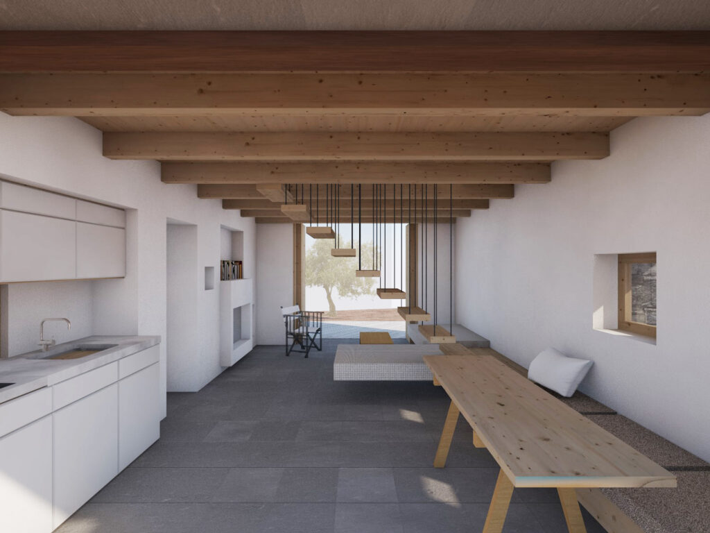 - Χρησιμοποιεί αποκαθιστά και συντηρεί αυτούσια τα δομικά στοιχεία του υπάρχοντος κτηρίου και επεμβαίνει εσωτερικά μονο με ελαφριες ξύλινες κατασκευές εξοικονομώντας πόρους και ενέργεια.